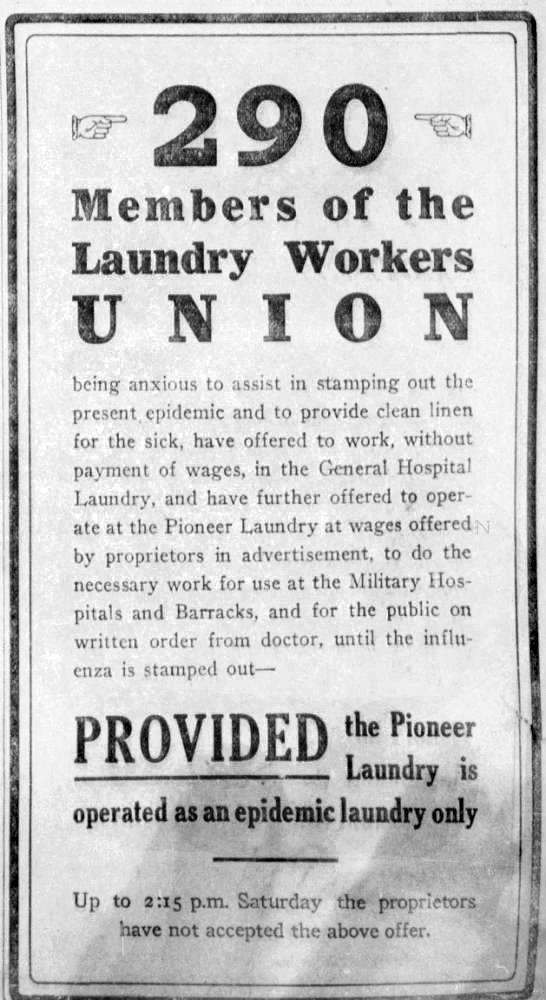 The deadly Spanish Flu was raging at the time, and the public feared unwashed laundry would make the situation worse. The union offered to clean hospital and military laundry under conditions. There was no response. In December, the provincial Minimum Wage Board set the wage for female laundry workers at $13.50 a week, and that was enough to end the strike. The union ensured the 100 workers who were blacklisted were given financial support until they found other work.