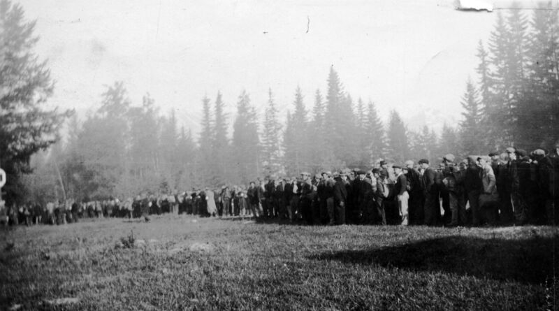 Men traveling on the On-to-Ottawa trek line up for stew in Golden, BC in 1935. Golden Museum & Archives P4267