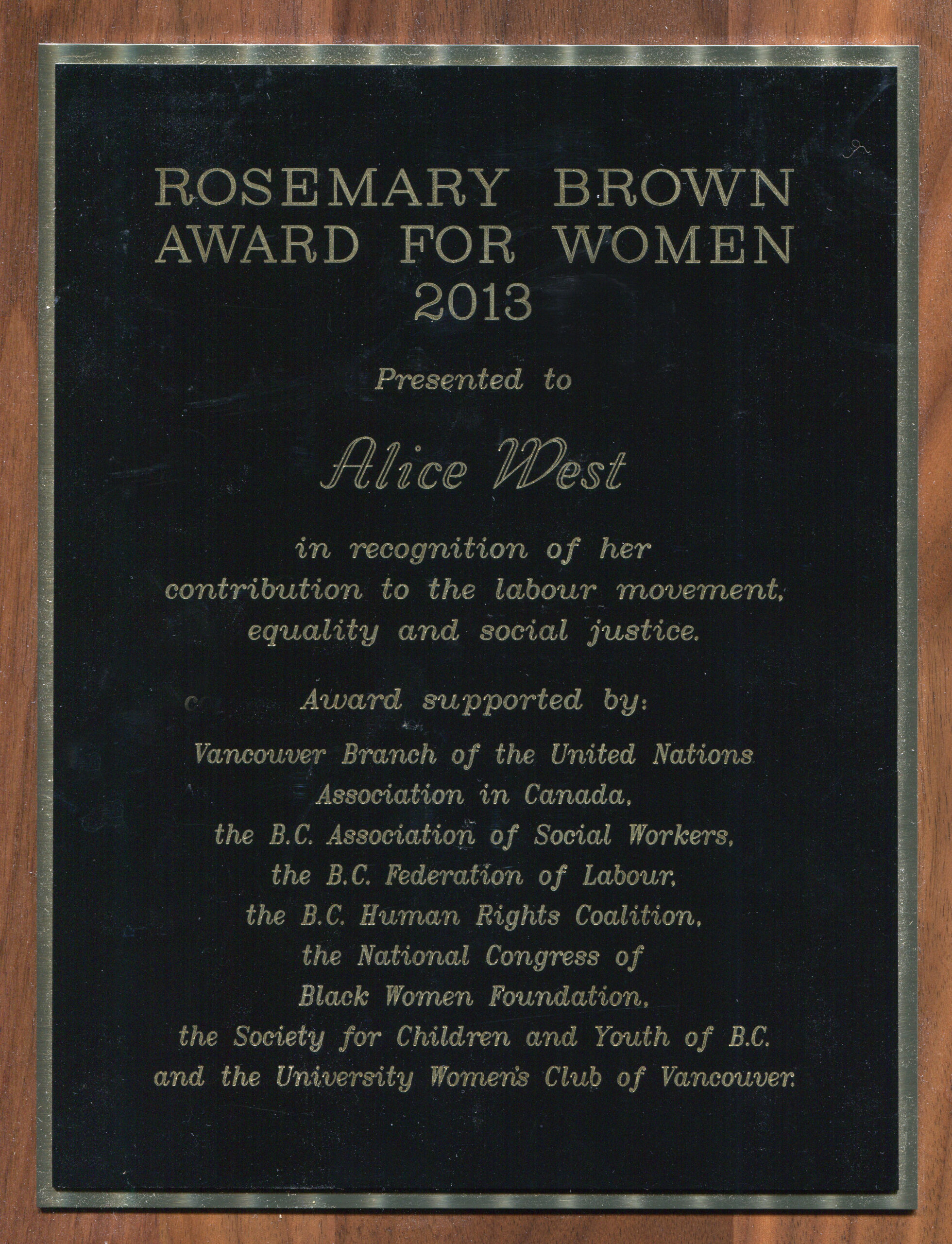 That same year, she was awarded the Rosemary Brown Award for women, as someone who had made an outstanding contribution to women in the labour movement.