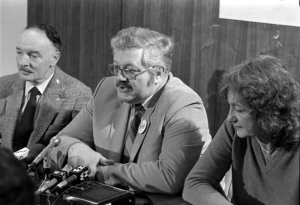 Solidarity Coalition representatives (left to right) Father Jim Roberts, Art Kube and Renate Shearer, October 10, 1983 . Pacific Tribune Photo Collection, SFU Library, MSC160-896_4A