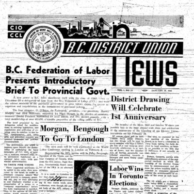 BC District Union News was published by the BC, Yukon and Northwest Territories locals of the International Union of Mine, Mill and Smelter Workers. The union was often referred to as “Mine Mill.”