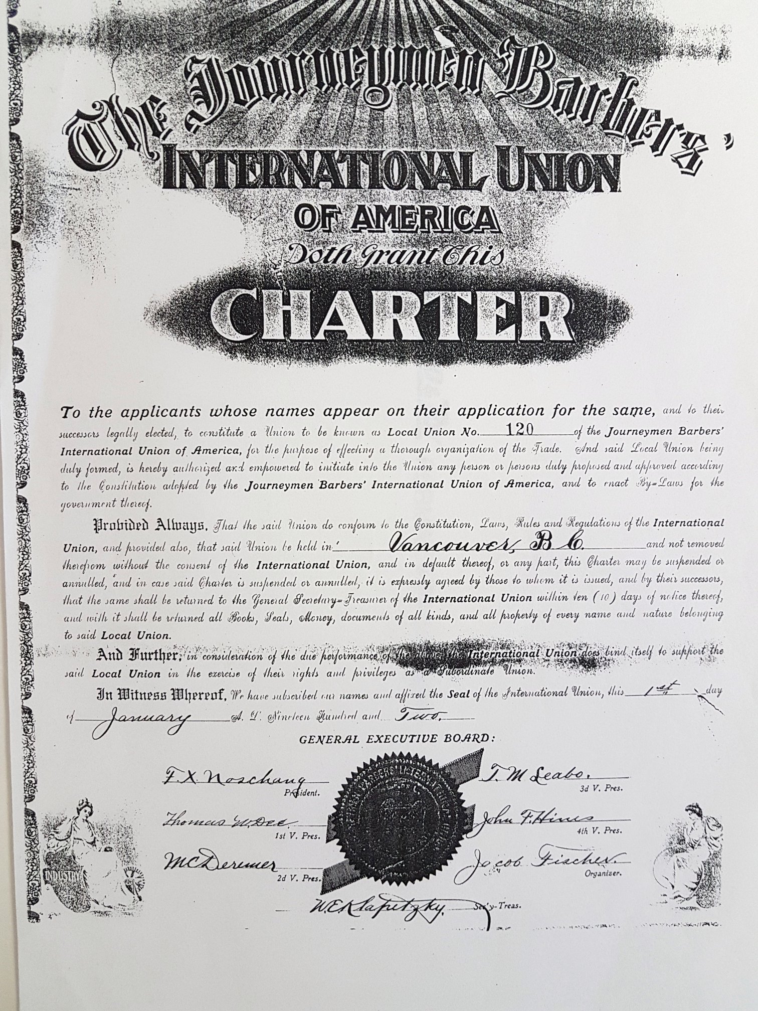 The Journeymen Barbers International Union Local 120 was established in Vancouver in 1902. In its heyday there were 1,600 members in Vancouver and 1,100 in Victoria. The United Food and Commercial Workers are the successor union.
