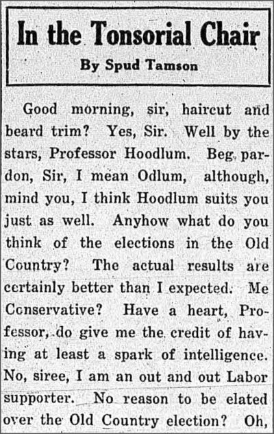 From 1924- 1929, Skinner wrote a column in The Labour Statesman under the assumed name of “Spud Tamson” where he somtimes posed as a barber interacting with his customers.