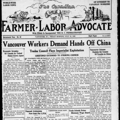 The Canadian Farmer-Labor Advocate was published weekly in Vancouver, BC between 1925 and 1926. It began publishing after the British Columbia Federationist folded. Farmer-labour movements were growing and challenging the existing economic and social order.