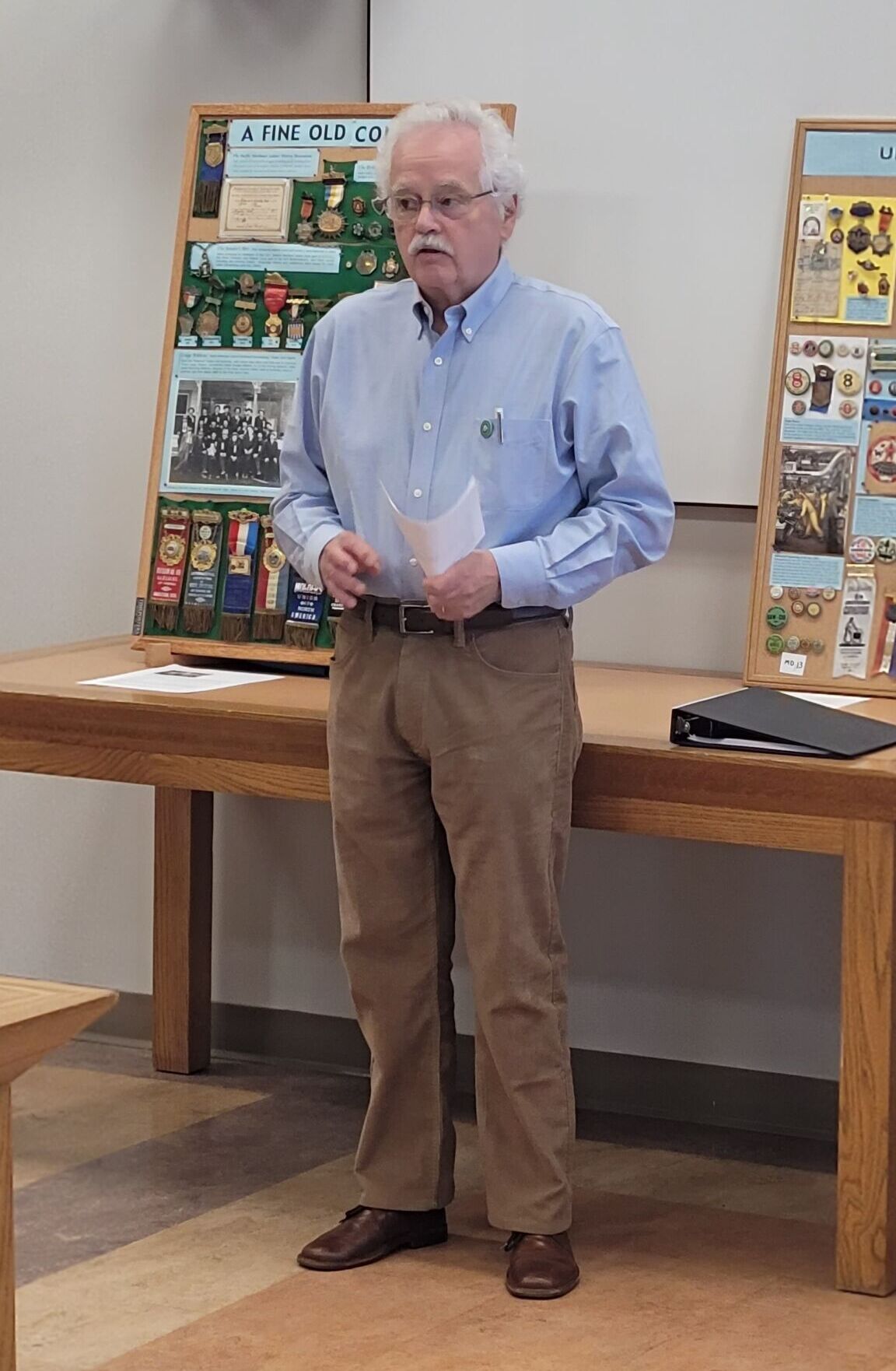 DY [01:04:45] Those plaques are always an interesting exercise because typically they involve boiling down a significant and usually kind of complex story into a small number of words that give you a decent overview of the situation, that’s accurate and will stand the test of time. And I guess I have some experience in trying to do that. And so I’m involved in checking out the texts and making suggestions about wording and following through on some of the plaque projects. I find that interesting because it makes you feel good if you can actually cobble something together that does a whole bunch of different purposes at the same time. I put together a small collection of pins that’s on the wall at the Centre that the Centre inherited from Jim Young. Jim Young was a newspaper man and an exceptionally avid pin collector himself, and he had a number of pins that came to the Heritage Centre, so I did a little bit of a display of those. But I used to be involved with the walking tours, but I’m getting too old to do walking tours. There are some great people that are carrying on with the walking tours, so I thought I’d pass it on to them. But no, that’s about it.