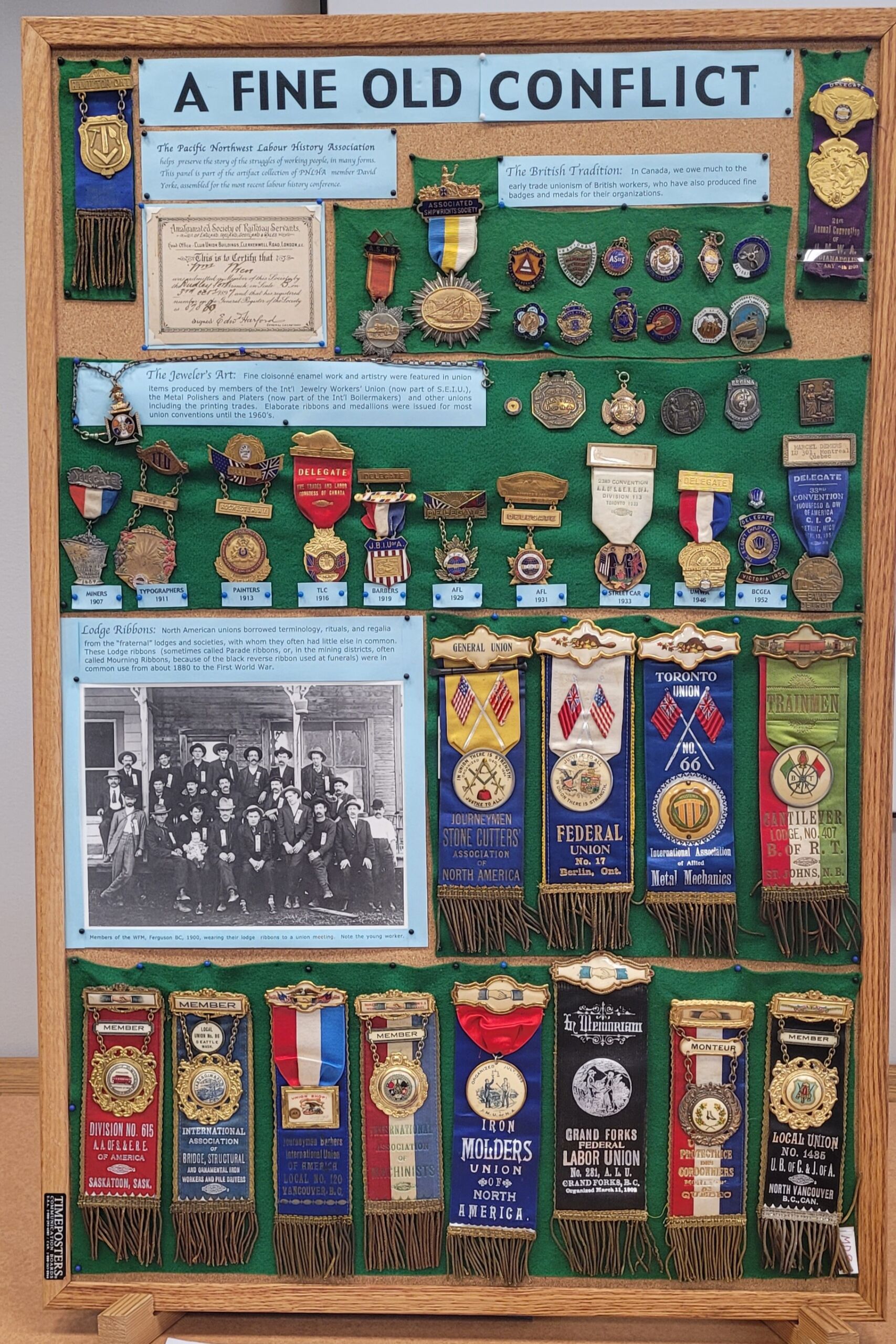 DY [00:43:17] There were, in the earlier periods quite elaborate membership ribbons, there were convention regalias with medallions, and a lot of material that reflected the history of the unions and in its emblematic aspect reflected aspects of the union movement. For example, the national aspects, whether there were patriotic symbols like maple leaves and beavers, or in the American unions great eagles and so on. A lot of the tools of the trade were reflected in some of the memorabilia that were there. Some of it reflected the sort of changes in technology that we’re facing. I always remember the Longshoremen’s Union. In the early days, there would be a ship with a fellow with a handcart. Later on, that was completely replaced by ships just loaded to the gunnels with containers. That is the sort of change in the industry that was actually reflected in the buttons and badges and pins that they wore.