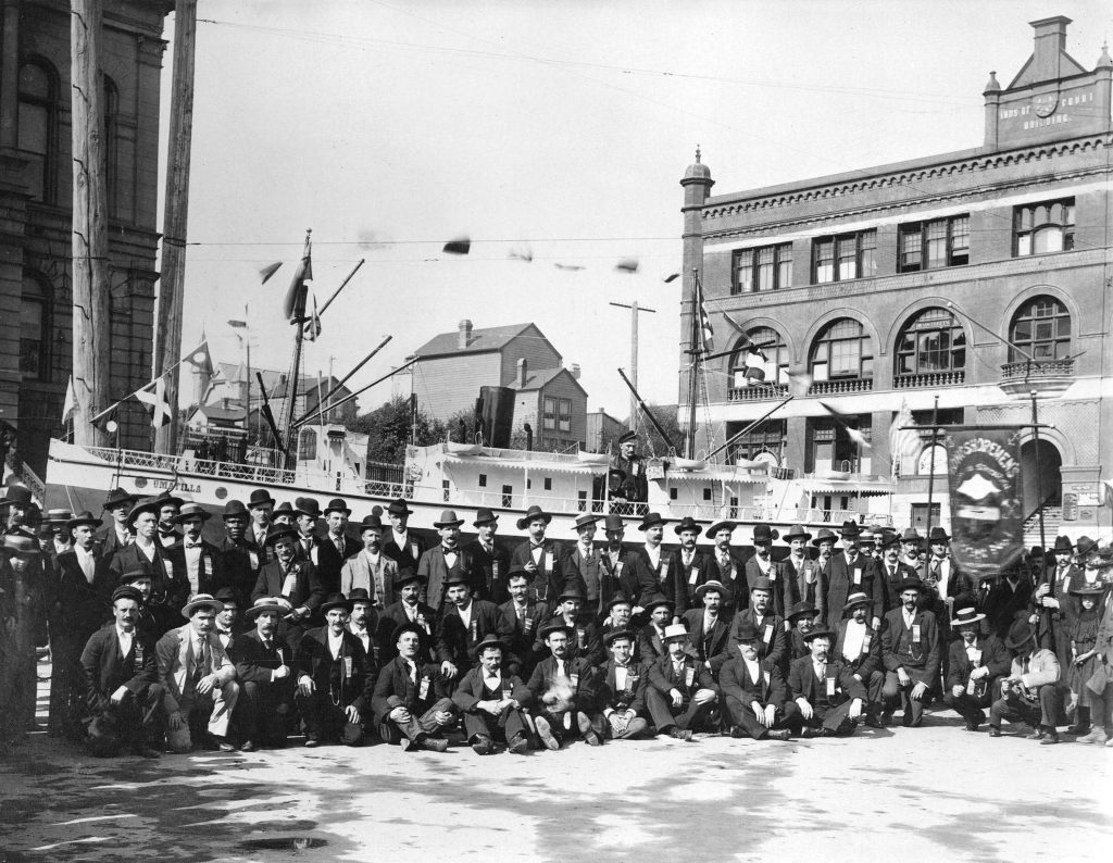 This image is from a Labour Day parade on Hastings Street in Vancouver in the late 1890s. Here we see a 40-foot replica of the S.S. Umatilla, a ship that connected Vancouver and San Francisco. Constructed in 1898 by local stevedores, and named for the village of Umatilla on the Columbia River, the miniature vessel belched steam along the entire route of the Labour Day procession with upwards of 140 marching longshoremen eyeing their creation proudly from behind. The men assembled for the S.S. Umatilla photo, dressed in their finest garb festooned with “badges richly trimmed with gilt lace,” were claiming social recognition as small producers and citizens, asserting their respectability.