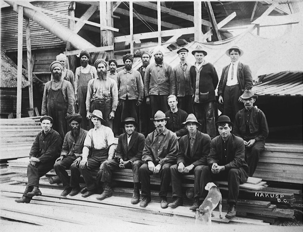 Workers at the Quance and Carlson sawmill in Nakusp are seen ca. 1912-13. Among those pictured are Lashman Singh, Serhan Singh, Jagat Singh, and Santa Singh. South Asians worked at mills in several Arrow Lakes towns. Arrow Lakes Historical Society 2014.003.5347