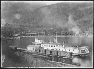 A View of Kaslo Bay sometime before 1908, showing the SS International docked in the foreground and the sawmill and planing mill in the background. Kootenay Lake Historical Society 991.005.0010.