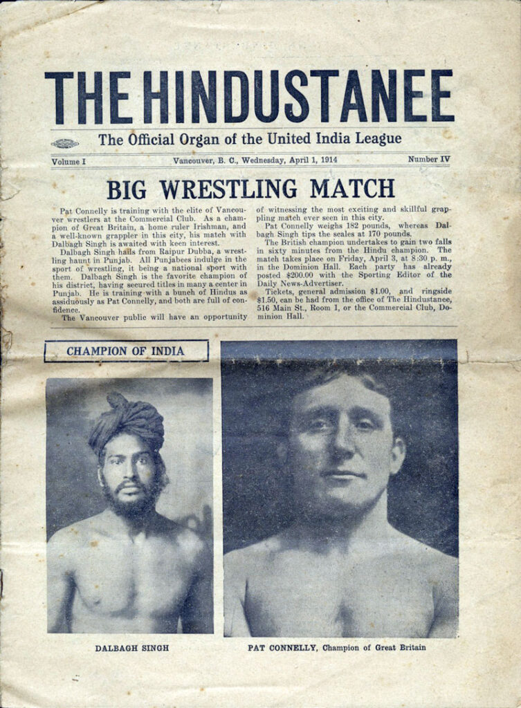 Wrestling was very popular in South Asia and many wrestlers came to B.C., as seen in this 1914 Vancouver publication The Hindustanee. Older generations reportedly stressed it as a form of self-defence and it remained popular among South Asians in Canada.