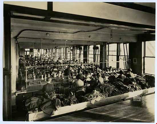 Inside, women workers sat in long rows, assigned work as machine operators and finishers, while men had jobs as knitters and supervisors. Garments were constructed in assembly-line style, and workers were paid on a piece-work basis, with separate rates based on gender.