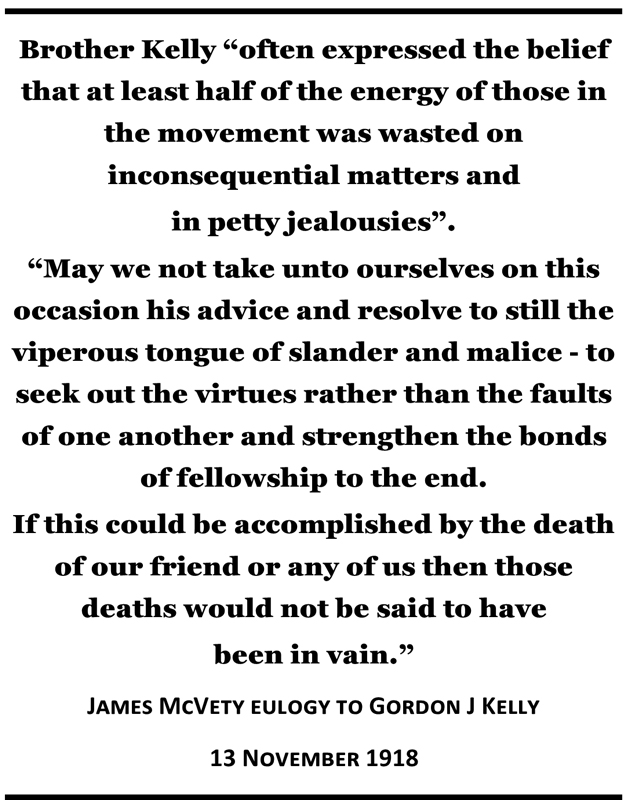 A Roman Catholic priest lauded Kelly as a man “who had devoted his life to the cause of Labor. He was fair-minded and in consequence thought well of by all classes in the community. May you follow his examples.” ((British Columbia Federationist 15 Nov 1918, 1 http://dx.doi.org/10.14288/1.0345515))