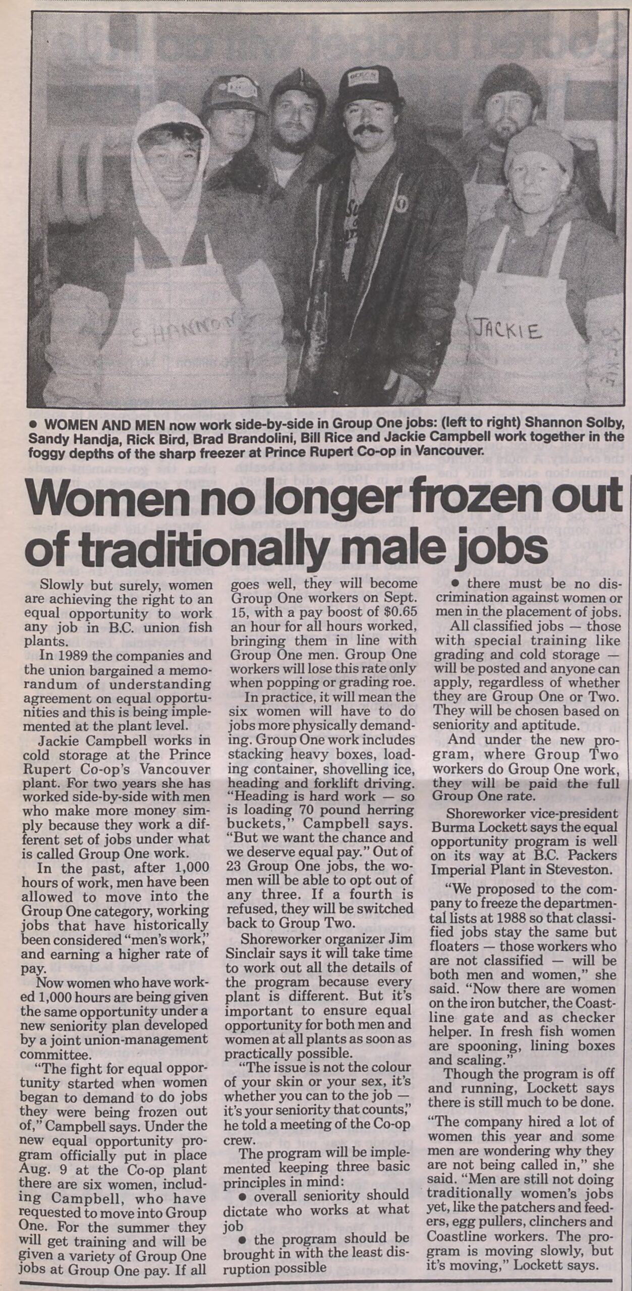 At the time, in the 70s and 80s, there was a two-tiered wage system in the industry. Group One work was physically difficult and better compensated than Group Two work, but only men were eligible for Group One. Jackie and other women successfully fought for the right to work in cold storage doing Group One work. She cites this as one of her proudest achievements. She explains that a lot of battles had to be fought within the union itself, but that the fact that they were able to make these changes speaks well of the UFAWU and their processes.