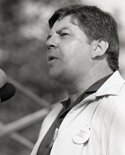 Mike Kramer speaks at rally following Walk for Peace, 1983. Pacific Tribune photo MSC160-823_28.