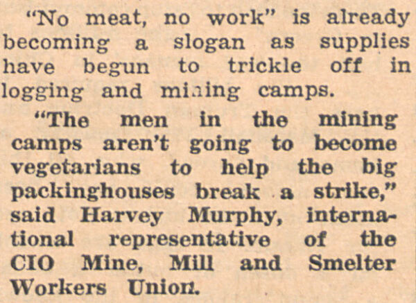 The strike was illegal under Bill 39, but the packinghouse workers were part of a broader movement. Steelworkers and IWA furniture makers were already on strike themselves, and soon more unions joined the fray. The Railway Engineers refused to move cars for striking packinghouses. Mine-Mill and the IWA both warned they’d stop operations if their camp kitchens ran out of supplies. “No meat, no work” was the slogan. Meanwhile, the union warned the public: ‘if reputable plants were shut down, any meat that was available might not be safe.‘