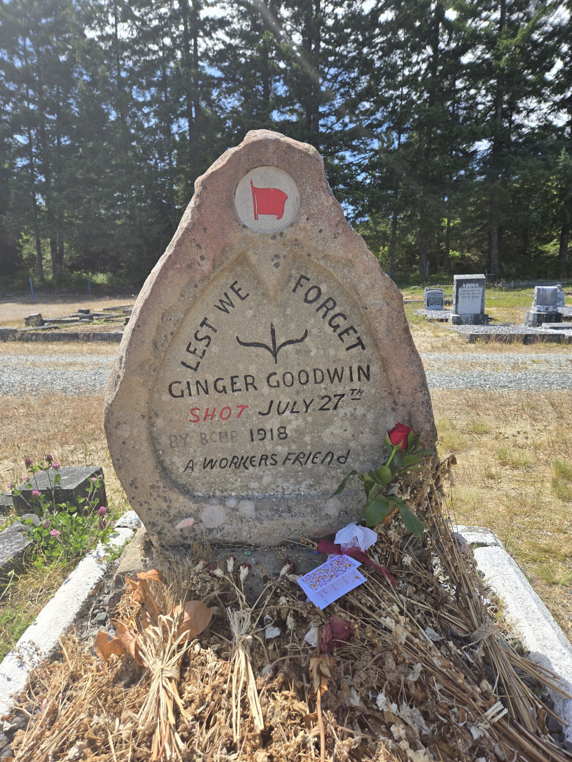 Ginger Goodwin was a young miner and union activist whose medical exemption from military service was cancelled when he organized a strike at the Trail smelter. He appealed and was denied, and fled to Cumberland to evade the draft. He was shot and killed by a former police officer. His death sparked a general strike in Canada.
