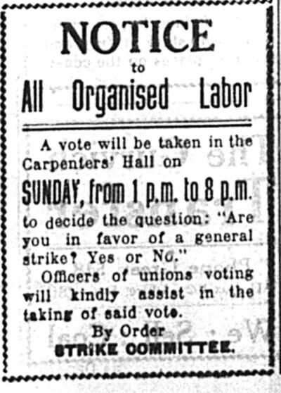 The vote was 345 to 105 to give the Strike Committee authority to call a general strike in Prince Rupert. Only the Retail Clerks Union and the International Brotherhood of Electrical Workers were opposed.