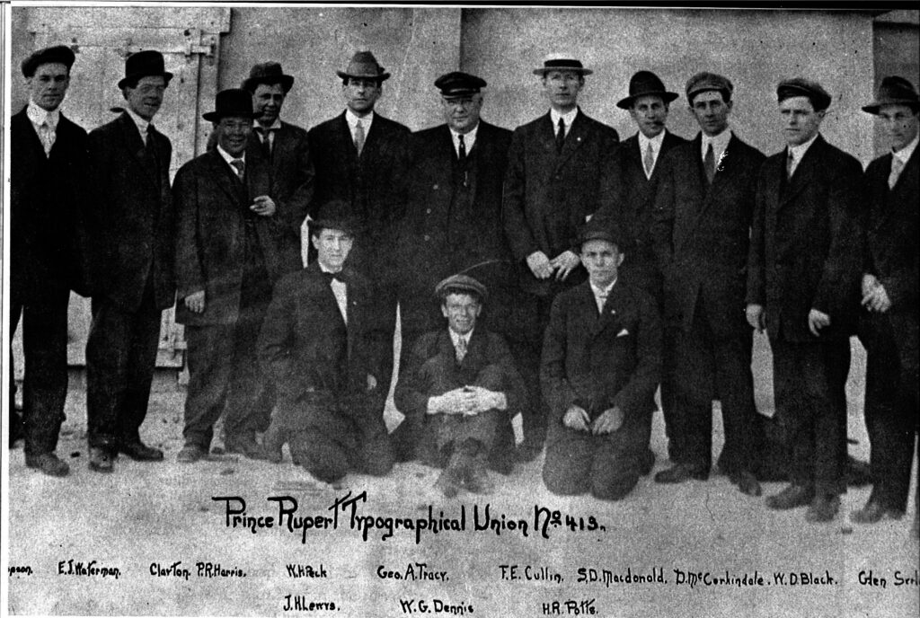 The Prince Rupert local of the International Typographical Union. Simon MacDonald (fourth from right, standing) was President of the Prince Rupert Trades and Labour Council and supported the creation of the One Big Union at the Western Labour Conference in Calgary in March 1919. His union did not participate in the Prince Rupert sympathetic strike, but the Evening Empire where he worked published Strike Committee Bulletins. Photo Credit: Museum of Northern BC.