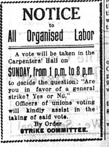 On the evening of May 30, 1919, a lengthy meeting of Prince Rupert labour was convened at the Carpenter’s Hall to discuss the situation. The union hall was full; people were standing outside peering through the windows and straining to listen to the debate. The vote was 345 to 105 to give the Strike Committee authority to call a General Strike in Prince Rupert. Only the Retail Clerks Union and the International Brotherhood of Electrical Workers were opposed.