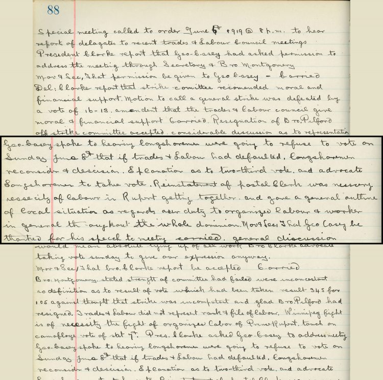 Casey, who had organized local support for the OBU, was a vocal supporter of the general strike and told the Longshoremen that a new vote would be held June 8; he urged them to participate. This time the vote would require a two-thirds majority. With typical fiery rhetoric, Casey said the labour community in Prince Rupert had a “duty to organized labour and workers in general throughout the whole dominion”.