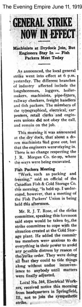 The meeting passed a weakly worded recommendation from the Strike Committee that they offer only moral and financial support to those unions on strike. The Prince Rupert General Strike was in peril and the Longshoremen’s Union was furious. Their representative on the Strike Committee resigned.