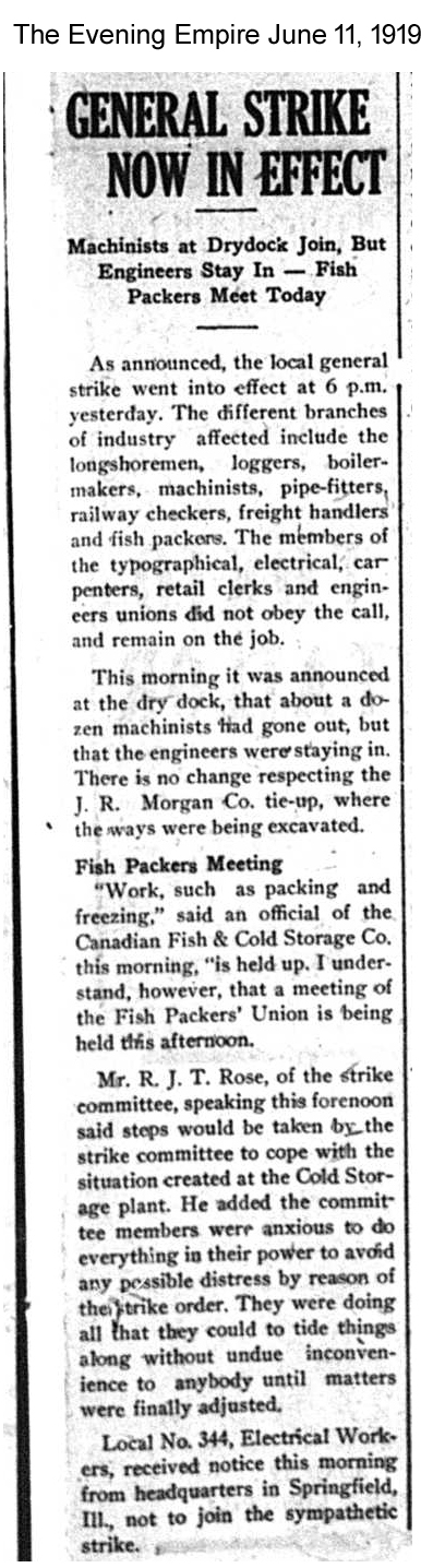 The Labor Council pressed ahead and announced the Prince Rupert General Strike would start on June 10 at 6 pm. At the agreed-upon time, longshoremen, loggers, boilermakers, machinists, pipe-fitters, railway checkers, freight handlers and fish packers all joined in as did about a dozen machinists who worked at the drydock.
