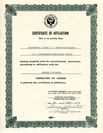 ○ BCGEU LCB Branch, Local 2, S. Vancouver Island certificate of affiliation, to BC Federation of Labour (April 1, 1973)