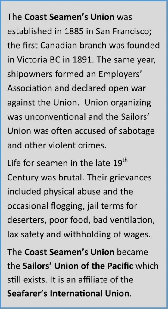 The Coast Seamen’s Union was established in 1885 in San Francisco; the first Canadian branch was founded in Victoria BC in 1891. The same year, shipowners formed an Employers’ Association and declared open war against the union. Union organizing was unconventional and the Sailors’ Union was often accused of sabotage and other violent crimes.