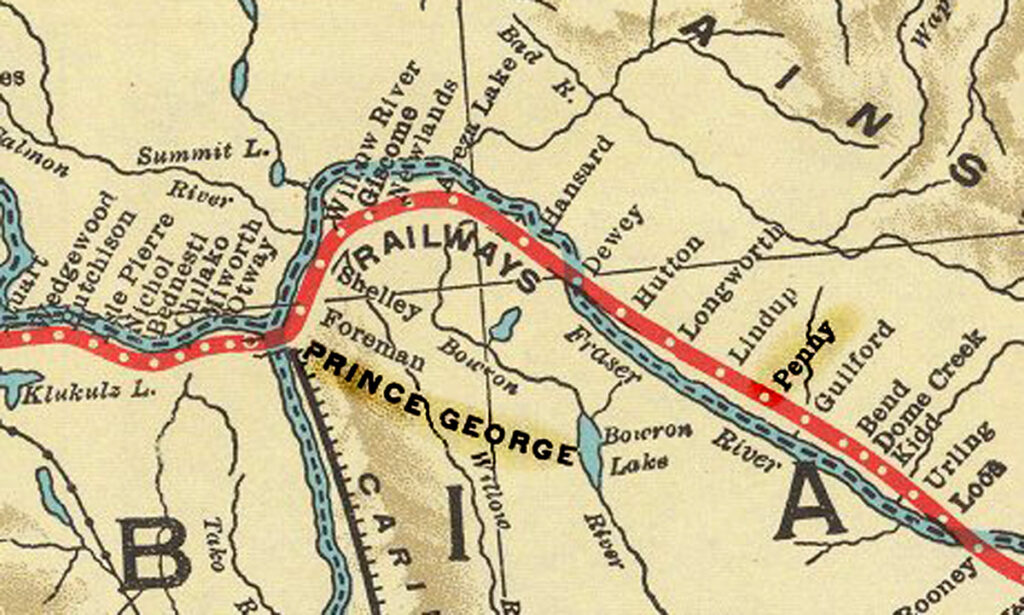 Map showing communities east of Prince George. A relief camp was established at Penny, B.C., as a means of controlling unrest in the city. Canadian National Railway. (1927). Alaska and the Yukon — Routes of Canadian National Pacific Coast Services, Canadian National Steamship Company Ltd. David Rumsey Map Collection.