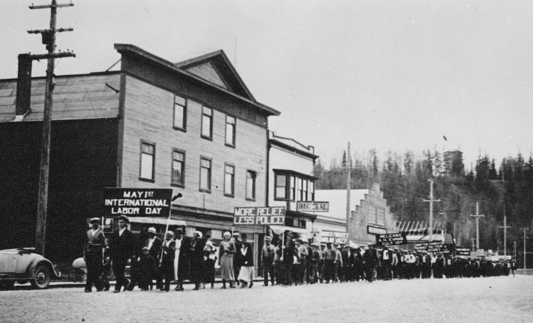 “A parade of protestors on George Street, Prince George, BC on International Labour Day, May 1st, 1933.” Fraser Fort George Regional Museum, P985.17.1.