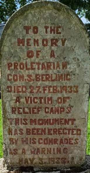 A three-and half-foot (one metre) high concrete headstone was erected at Berlinic’s grave in the Prince George cemetery two days after the parade. Not much is known about Berlinic, but his headstone remains at the cemetery as a testament to the failures during the economic crisis of the 1930s. The final two lines have been obliterated by time.