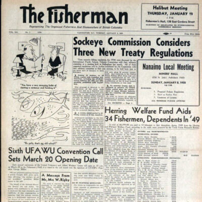 The Fisherman Publishing Society was established in 1937 to publish The Fisherman. Originally sponsored by the Salmon Purse Seiners Union and the Pacific Coast Fishermen’s Union, it later was published by the United Fisherman and Allied Workers’ Union (UFAWU). The newspaper documents industry events and encourages unity among West Coast fishermen.