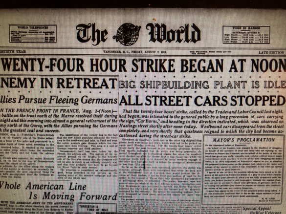 At 12 o’clock sharp on Aug. 2, 1918 – one hundred years ago today –Vancouver transit operators stopped their streetcars in mid-route, drove them to the barns and walked home. The city’s normally bustling waterfront fell silent, as 2,000 burly stevedores and shipyard workers streamed from the docks. Construction workers refused to pound another nail or lift another brick. They joined textile and other union workers across Vancouver who were also leaving their jobs. It was the start of Canada’s first general strike and the beginning of one of the most memorable 24 hours in the city’s history.