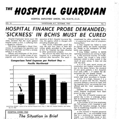The Hospital Employees’ Union‘s newsletter was launched as a mimeographed publication in 1950 and then reborn as the Hospital Guardian in 1958. The name was chosen after the Manchester Guardian in the United Kingdom.