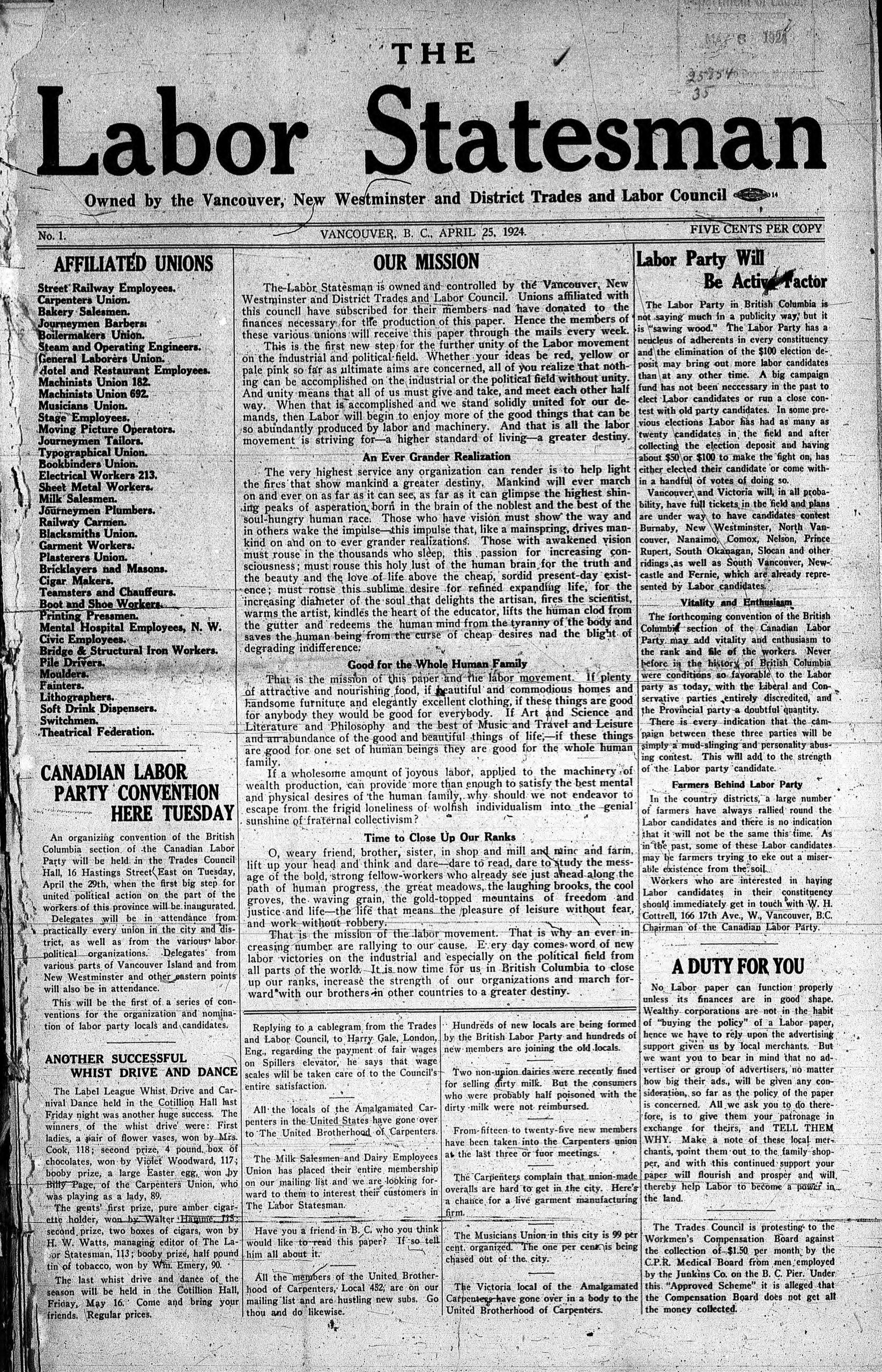 The first edition of The Labor Statesman hit the streets in Vancouver, B.C. on April 25, 1924. It would publish continuously for 45 years, ceasing publication in 1969.