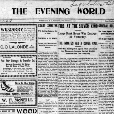 The Rossland Evening World was a four-page daily newspaper established on May Day 1901 in Rossland, BC, dedicated to supporting mine workers in the Kootenays. It was one of Western Canada’s first daily labor newspapers, owned by Local 38 of the Western Federation of Miners (WFM).