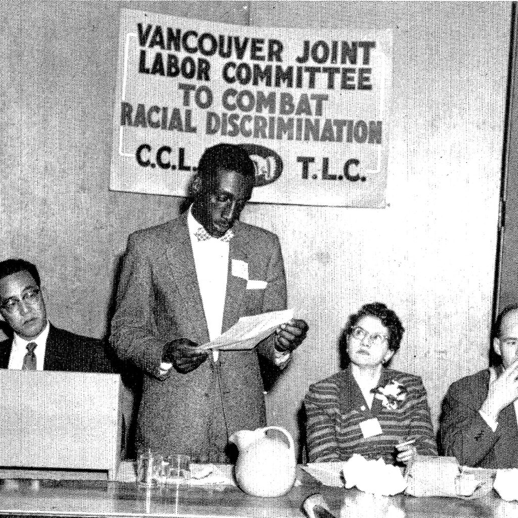 IWA union activist Emmitt Holmes stands in front of a banner reading “Vancouver Joint Labor Committee to Combat Racial Discrimination”. The labour community became involved in the calls for justice early in the Clemens case and continued to amplify the issue throughout the inquest. Patrick Kerr photo, BCLHC Archives.