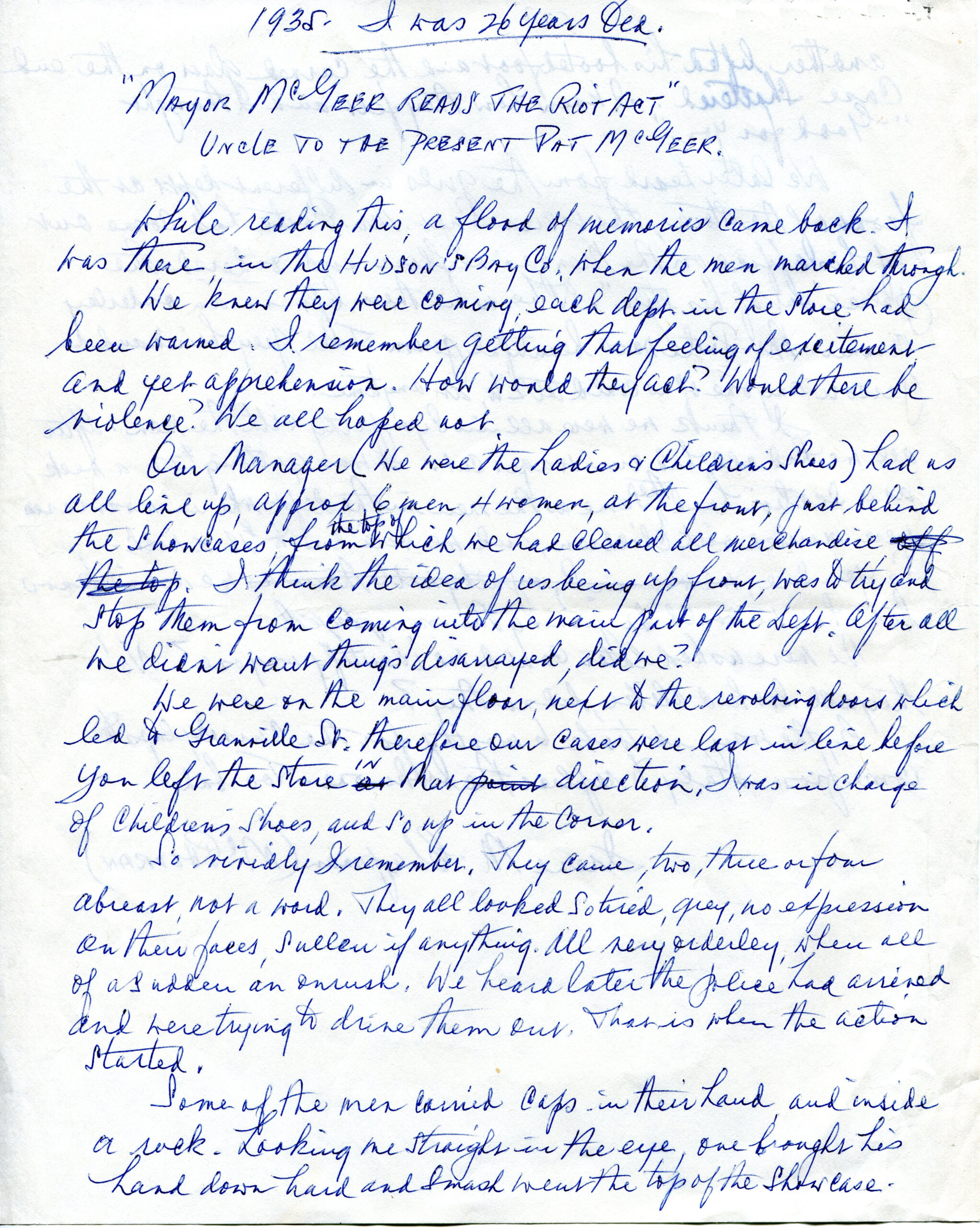 This handwritten account of the events on April 23, 1935 was donated to the BC Labour Heritage Centre’s archive files. Irene Chapman’s recollection as a 26-year old clerk at the Hudson’s Bay department store shows the widespread public support of the relief camp strikers in Vancouver. Her description of the men is poignant. She explains how the store manager placed the blame for property damage on the police who he ordered “out of his store”.