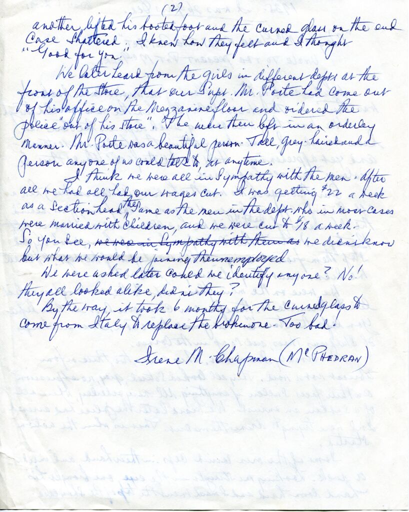 I think we were all in sympathy with the men. After all we had all had our wages cut. I was getting $22 a week as a section head, the same as the men in the dept who in most cases were married with children, and we were cut to $18 a week.