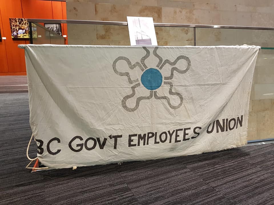 “I could not believe my eyes! He was on his hands and knees and he had a pale blue bedsheet, a Styrofoam coffee cup and a black felt marker in his hand. He was just finishing production of a BCGEU flag.”