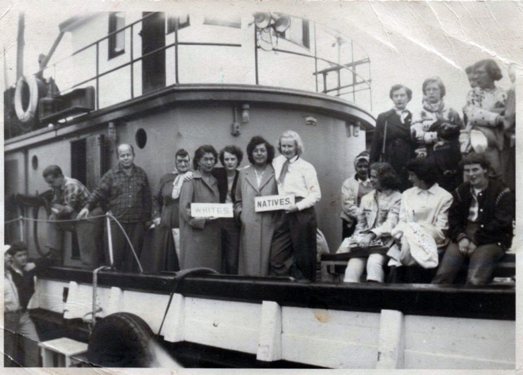 “ALL FRIENDS TOGETHER. Shop stewards at Namu, UFAWU and Native Brotherhood, hold up to ridicule signs labelled “Whites” and “Natives” they took down from cannery washrooms last month. From left to right the quartette holding the unwanted signs are Mrs. Mary Hall, Native Brotherhood, Marilyn Fredericksen, UFAWU; Mrs. Kitty Carpenter, Native Brotherhood, Mervene Beagle, UFAWU. That’s Bill Rigby in the left hand corner. Scene was aboard the “Texada” when the girls gathered for a sendoff to the Bella Coola Cannery girls during the tendermen’s strike. Incidentally, the Bella Coola girls returned a few days later.”