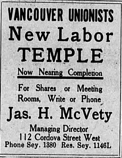 Trades & Labor Congress of Canada, Vancouver Labor Temple, 1915. David Yorke Labour History Collection, Simon Fraser University