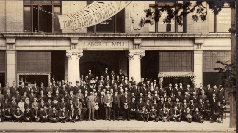On June 16, 1912, VTLC delegates gathered for an official photograph in front of the Labor Temple, according to Council minutes. Though the picture likely disappeared long ago, the delegates’ gesture reveals their union and civic pride.