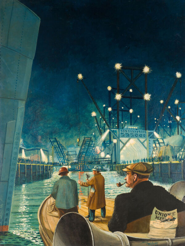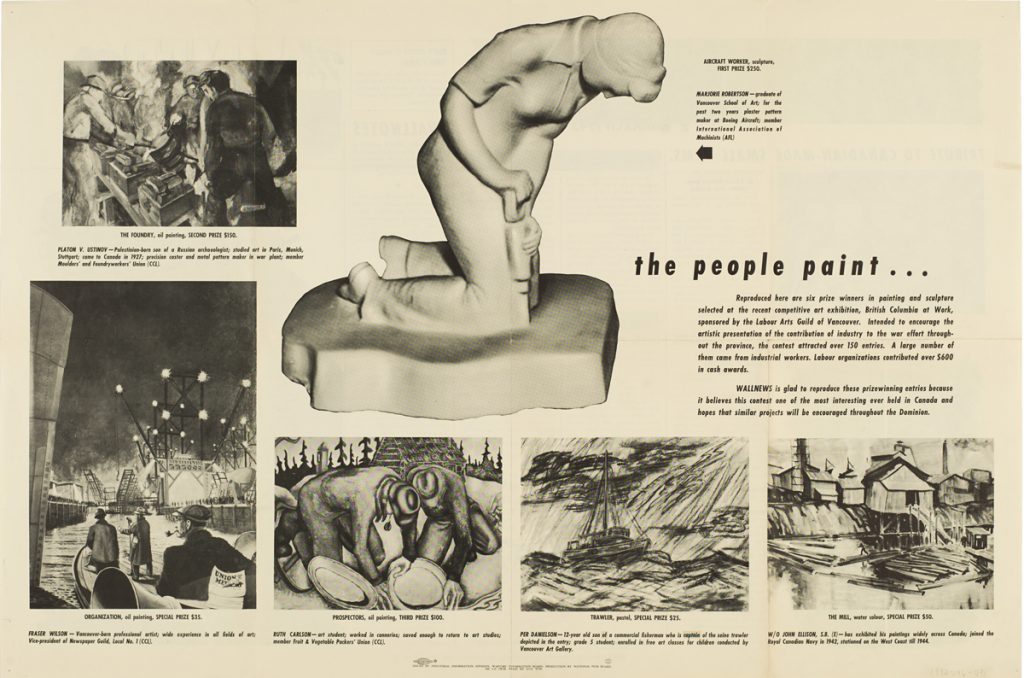 British Columbia at Work focused on the “industrial life of our Province…thereby stress[ing] the considerable and varied contribution made by our workers to the victory of Democracy over Fascism”, according to the 1945 exhibition guide. “This venture was unique in the history of Canadian art…and national recognition of this fact was recorded by the reproduction of the winning exhibits in the Wartime Information Board’s publication of “Wallnews” for March of this year.”