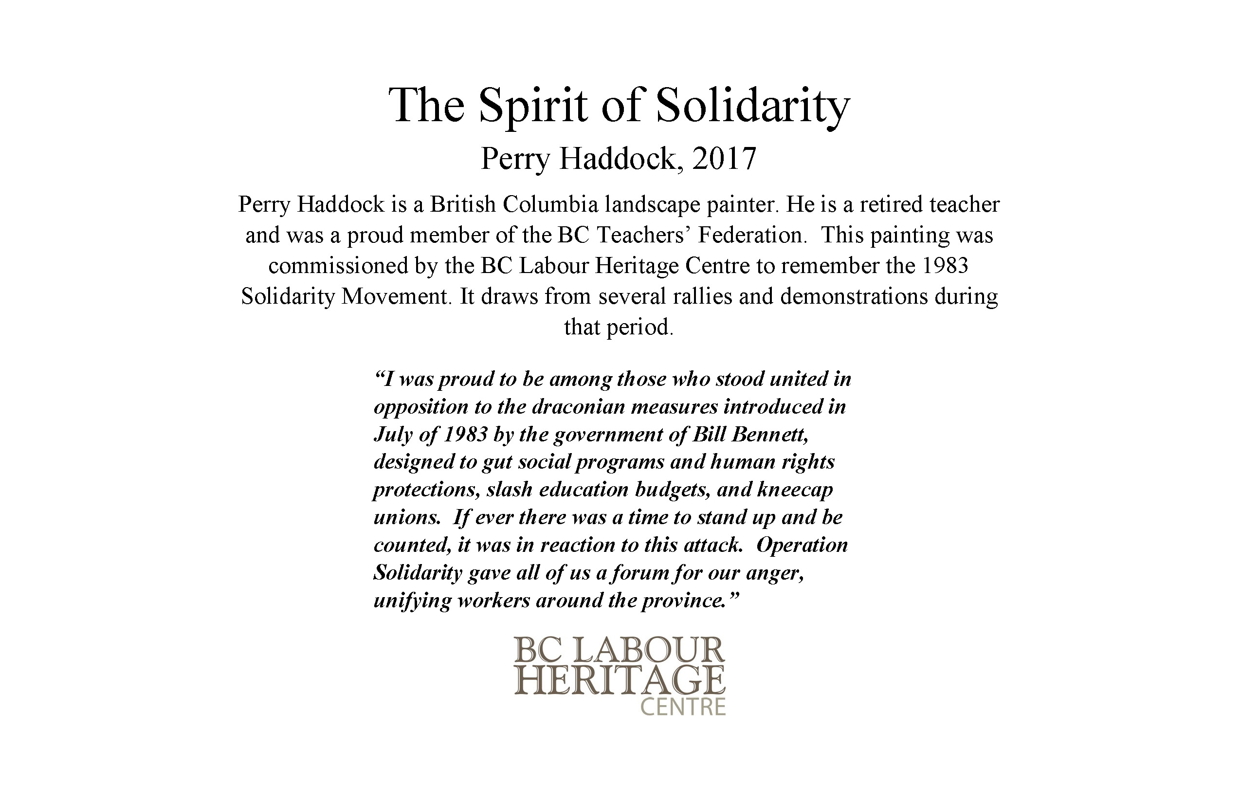 Limited edition print of a painting by Fraser Valley artist Perry Haddock is titled “The Spirit of Solidarity”. It represents the historic events of 1983 when hundreds of community, faith and social justice groups united with the labour movement in BC to resist government attacks on us all.