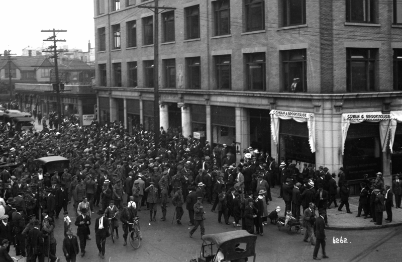 At 12 o’clock sharp on August 2, 1918, Vancouver transit operators stopped their streetcars in mid-route, drove them to the barns and walked home. The city’s normally bustling waterfront fell silent, as 2,000 burly stevedores and shipyard workers streamed from the docks. Construction workers refused to pound another nail or lift another brick. They joined textile and other union workers across Vancouver who were also leaving their jobs. It was the start of Canada’s first general strike and the beginning of one of the most memorable 24 hours in the city’s history.